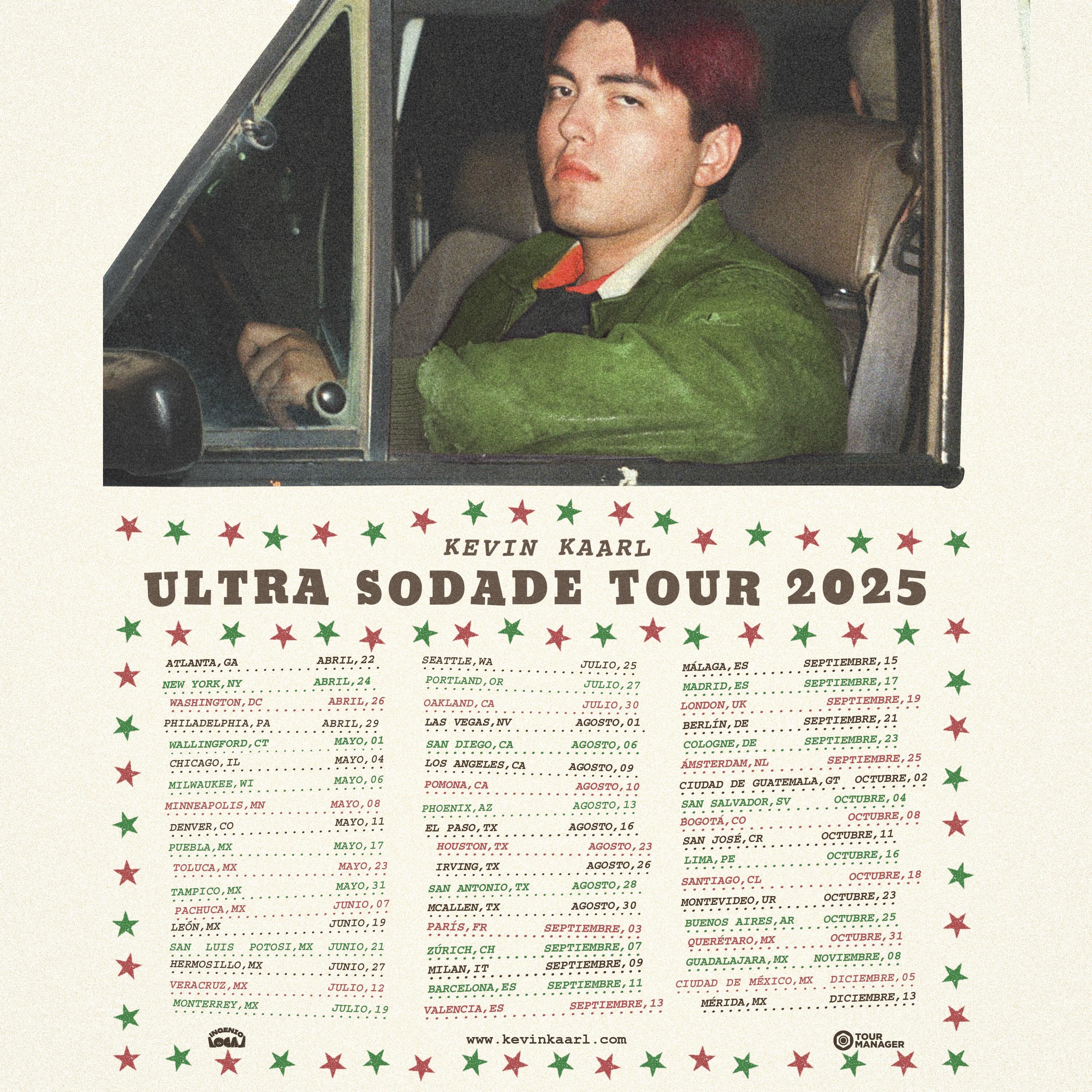 26 de febrero de 2025 (Miami, FL) – Tras el exitoso lanzamiento de su aclamado cuarto álbum de estudio ULTRA SODADE, la estrella multiplatino del indie folk mexicano Kevin Kaarl anuncia su ambiciosa gira mundial que recorrerá cuatro continentes con más de 50 fechas confirmadas.