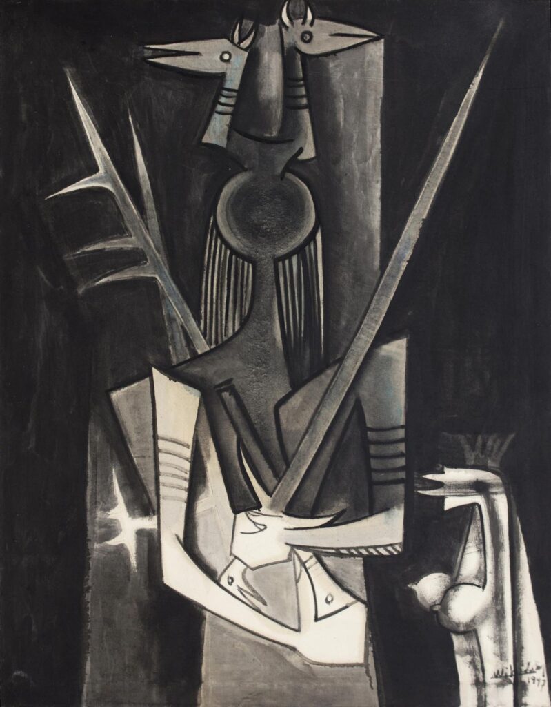 Wifredo Lam (1902–1982), *Le Guerrier I* [El guerrero] [*L’Initiateur*], 1947. Óleo sobre lienzo. 42 1/8 x 33 pulgadas; 107 x 84 cm. © Sucesión de Wifredo Lam.