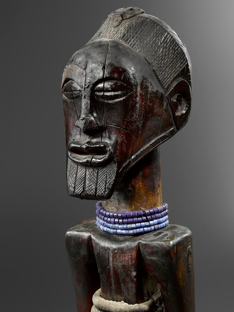 Un elemento central del argumento curatorial de la exposición es una presentación enfocada de las figuras Songye, consideradas uno de los objetos más formalmente distintivos y espiritualmente potentes de la tradición escultórica africana. Son la creación conjunta de un tallador experto y un practicante ritual capacitado, o *nganga* (pl. *banganga*). En toda África Central, estos especialistas rituales son los principales mecenas de tales objetos de poder. El escultor ha dividido el cuerpo de manera uniforme en secciones que definen la cabeza, el torso y las piernas. Cada una de estas partes permanece claramente visible a pesar de los materiales añadidos por el *nganga* a la escultura de madera, ya sea adheridos a su superficie o incrustados en su interior.