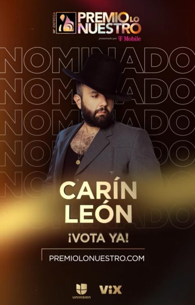| El Premio Lo Nuestro 2026 se entregará el próximo 19 de febrero en una ceremonia televisada por Univisión desde Miami, Florida. Los fans podrán votar en PremioLoNuestro.com. Con estas, Carín León suma al menos 29 nominaciones a Premio Lo Nuestro a lo largo de su carrera. En 2025, el cantante originario de Hermosillo, Sonora, llegó a la ceremonia como el artista con más nominaciones, 10, y triunfó en cinco categorías, entre las que destaca Canción del Año por “Una Vida Pasada” junto a Camilo. Las nominaciones a Premio Lo Nuestro marcan el inicio triunfal de un 2026 histórico para Carín, quien, dentro de pocas semanas, competirá por su segundo premio GRAMMY® consecutivo en la categoría de Mejor Álbum de Música Mexicana (Incluido Tejano) por Palabra de To’s (Seca). La ceremonia se llevará a cabo el domingo 1 de febrero de 2026 en Los Ángeles. |