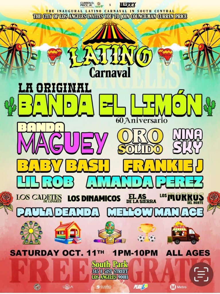 Los Ángeles, CA – 4 de octubre de 2025 — El corazón de South Central Los Ángeles se vestirá de fiesta con el Carnaval Latino inaugural, presentado por el Concejal Curren Price y Happy Group. Esta gran celebración gratuita y familiar reunirá a miles de personas en el marco del Mes de la Herencia Hispana, con un cartel musical de primer nivel encabezado por La Original Banda El Limón de Salvador Lizárraga, quienes continuan celebrando 60 años de trayectoria.