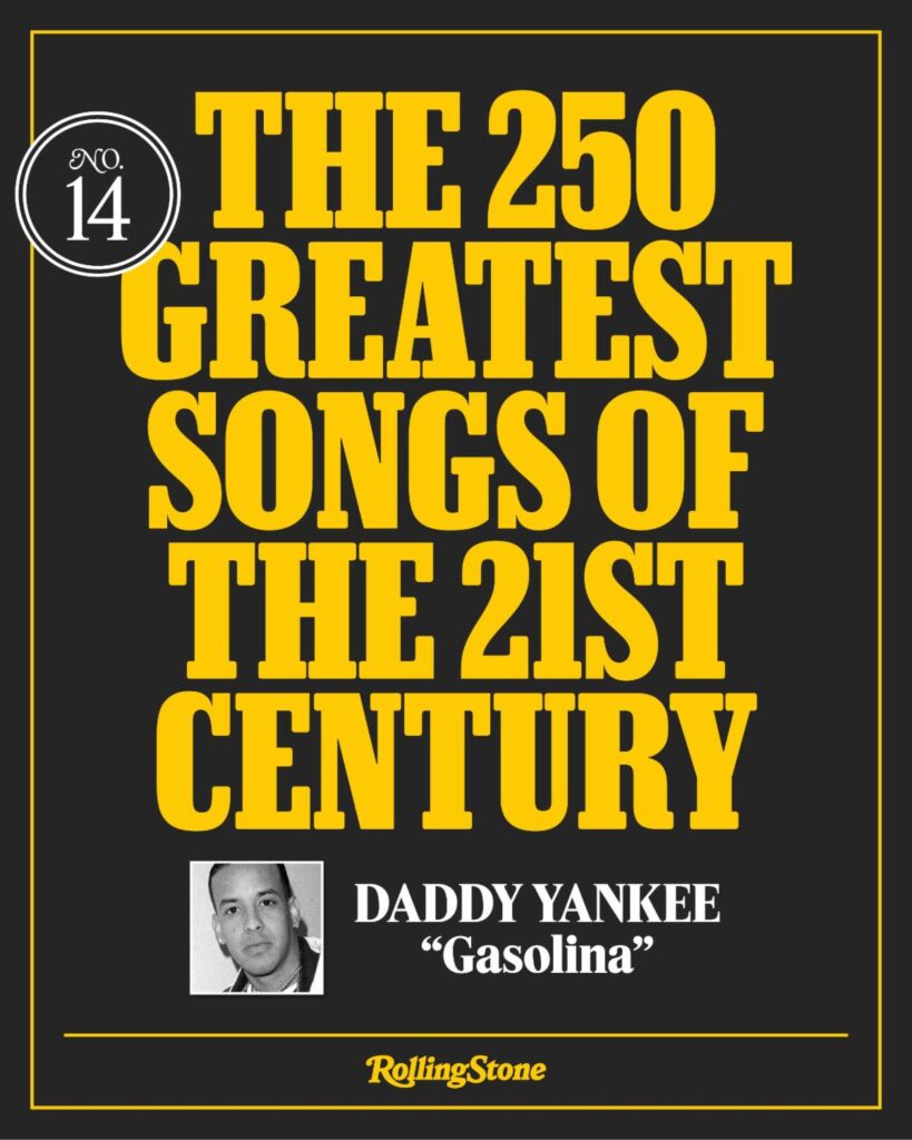 Miami, FL. (11 de octubre de 2025) – Daddy Yankee celebra un reconocimiento histórico por sus icónicas canciones. Rolling Stone incluyó dos de sus himnos más grandes, “Gasolina” y “Despacito”, en su lista de las 250 mejores canciones del siglo XXI, consolidando su lugar en la historia de la música contemporánea. Mira la lista completa de Rolling Stone AQUÍ.