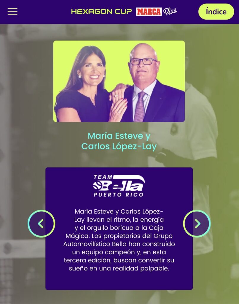 Entre los ocho equipos participantes destaca nuevamente Team Bella Puerto Rico, franquicia propiedad de los empresarios María Esteve y Carlos López-Lay, quienes han logrado proyectar con fuerza el orgullo, la energía y la identidad puertorriqueña en el escenario internacional del pádel. Tras una segunda edición que dejó el listón altísimo —con más de 30,000 aficionados, localidades agotadas y un formato que enamoró al público—, la edición 2026 se presenta reforzada para soñar en grande.