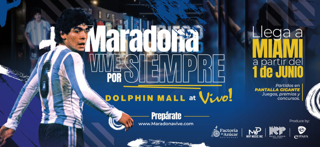 “MARADONA VIVE“, es una experiencia inmersiva sin precedentes que abrirá sus puertas en el Dolphin Mall, dentro del espacio de entretenimiento y gastronomía Vivo!. Que será un museo interactivo que invita a los visitantes a recorrer la vida, carrera y legado de uno de los íconos más grandes del Futbol: Diego Armando Maradona. A partir del 1 de Junio hasta el 30 de Julio.