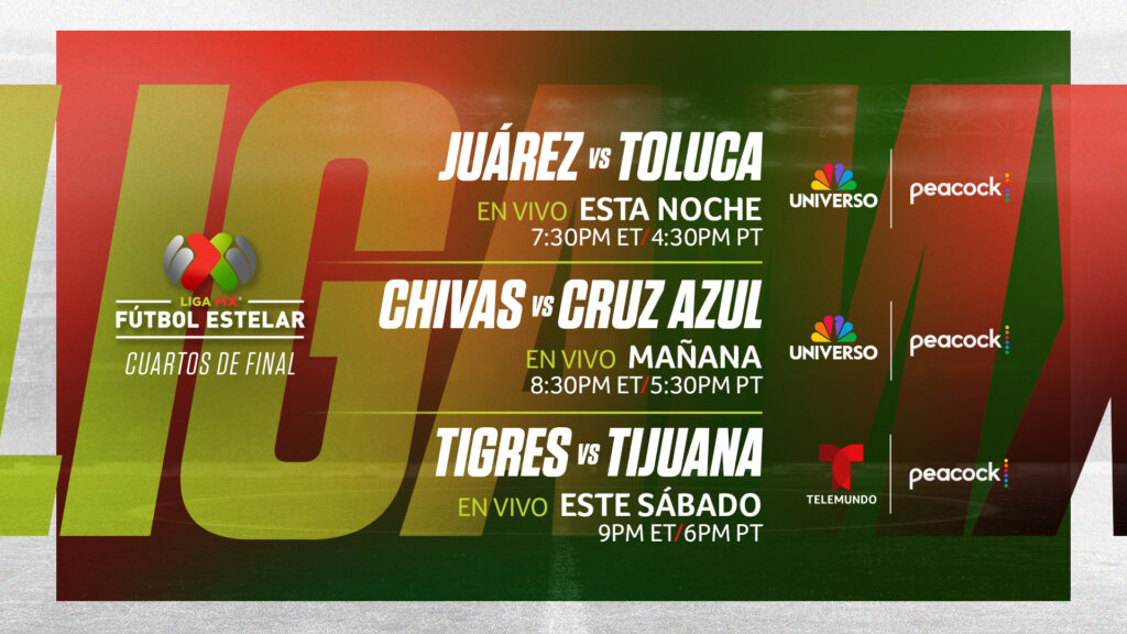 MIAMI, Fla. – 26 de noviembre de 2025 – Telemundo continúa con su cobertura ampliada de Fútbol Estelar Liga MX del torneo Apertura 2025, presentando transmisiones exclusivas de los partidos de cuartos de final de la Liguilla, con la participación de Chivas de Guadalajara, Tigres UANL y Bravos de Juárez esta semana. Todos los encuentros se transmitirán por Telemundo, Universo y Peacock, acompañados del programa previo y posterior Fútbol Estelar Liga MX Extra, sello distintivo de la cadena.