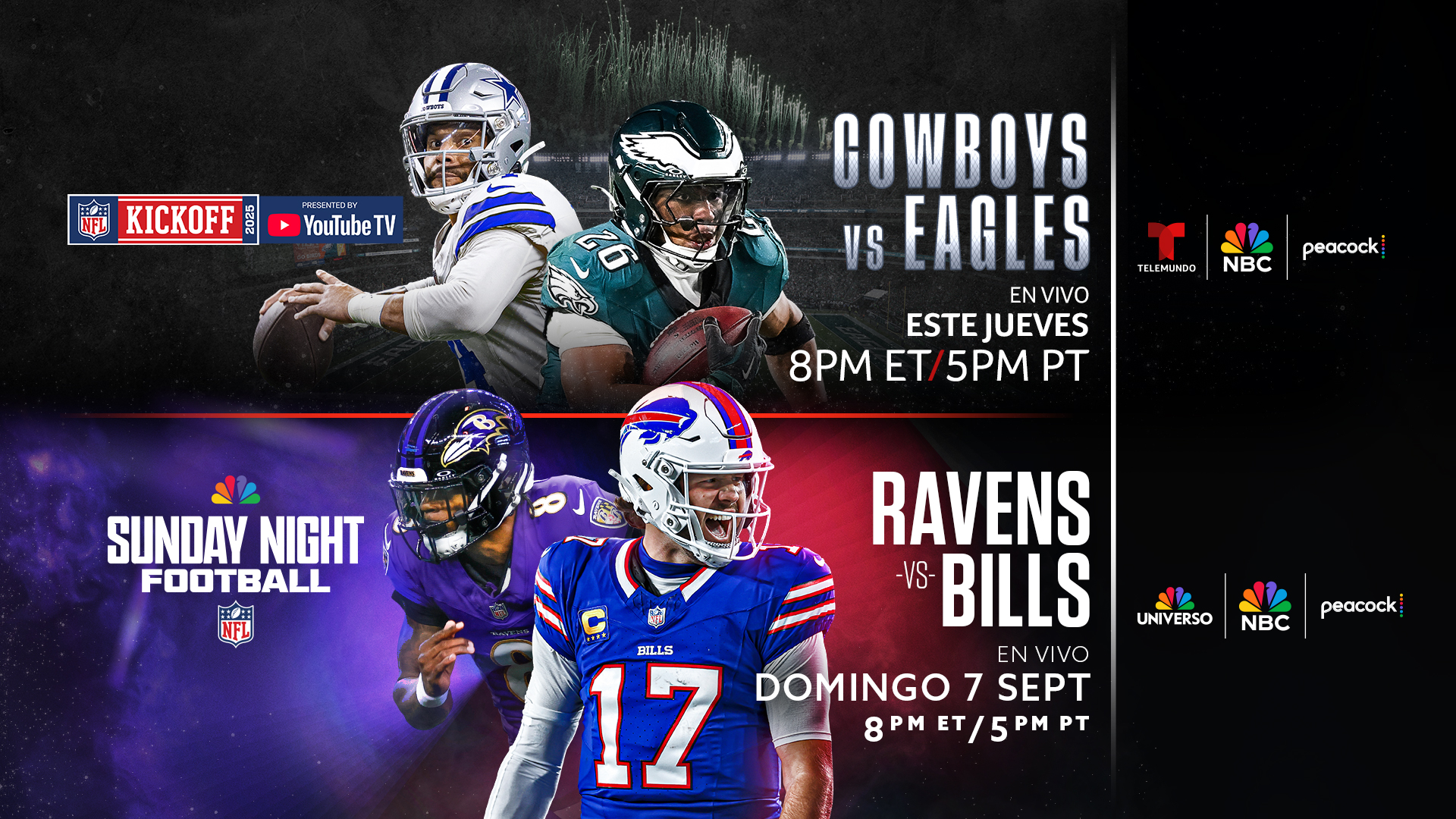 Tres noches después, el domingo, 7 de septiembre, el debut de la temporada de Sunday Night Football por Universo y Peacock presentará a los dos MVPs más recientes de la NFL: Lamar Jackson (MVP 2023) y los campeones del Norte de la AFC, los Baltimore Ravens, visitando a Josh Allen (MVP 2024) y a los campeones del Este de la AFC, los Buffalo Bills, en la revancha del Divisional de la AFC de 2024, que Buffalo ganó por apenas dos puntos. El partido también marcará el inicio de la 53ª y última temporada en Highmark Stadium, antes de la apertura del nuevo estadio de los Bills en 2026. Se presentará una entrevista con el campeón del Super Bowl Kyle Van Noy, quien ha militado las últimas dos temporadas en Baltimore.