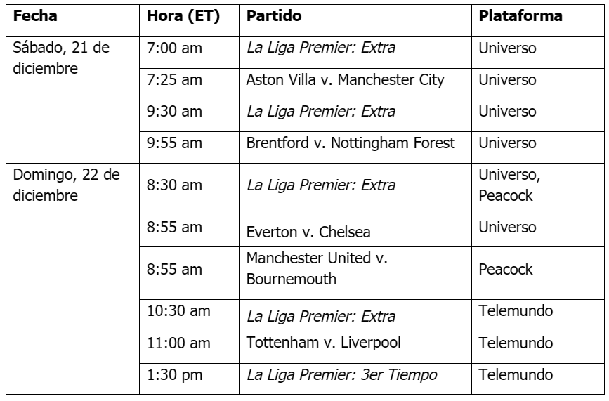 MIAMI, Fla. – 20 de diciembre de 2024 – Telemundo, la casa exclusiva en español de la Liga Premier, da inicio al periodo navideño de la temporada 2024-25. Este fin de semana, los aficionados disfrutarán de una experiencia futbolística inolvidable con cinco electrizantes partidos transmitidos por Telemundo, Universo y Peacock.