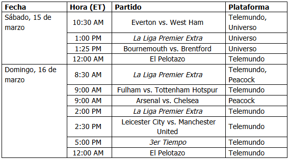 MIAMI, Florida – 13 de marzo de 2025 – Telemundo, la casa exclusiva en EE. UU. de La Liga Premier en español, ofrece cobertura completa de la jornada 29 encabezada por el choque entre Arsenal y Chelsea el domingo, 16 de marzo a las 9 a.m. por Peacock.