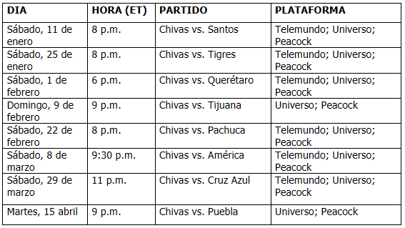 MIAMI, Florida – 8 de enero de 2025 – Telemundo, la casa exclusiva en EE. UU. de Chivas de Guadalajara, ofrecerá cobertura completa de todos los partidos en casa de Chivas durante el Torneo Clausura 2025 de la Liga MX. Los partidos se transmitirán por Telemundo, Universo y Peacock, acompañados de los programas emblemáticos de la cadena: Fútbol Estelar Chivas Extra, un programa previo de una hora y un postpartido de 30 minutos.
