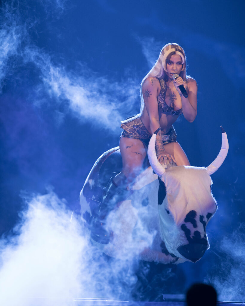 María Becerra llevó el universo de QUIMERA al escenario con una explosiva presentación de “Hace Calor”, mientras que Tokischa fiel a su irreverencia, sorprendió interpretando “Ridin” & “Miami” con una puesta en escena muy a su estilo, montada en un toro mecánico.